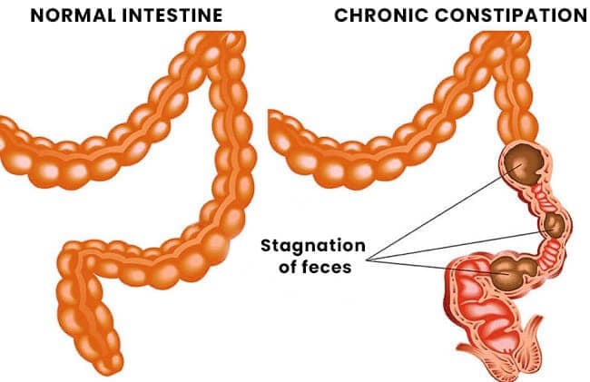 Sometimes constipation can be so severe that the peristalsis of the colon occurs only once a few days or even once a week. This allows huge amounts of fecal material to accumulate in the colon, causing bowel sprains up to 7.5-10 cm in diameter.